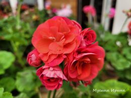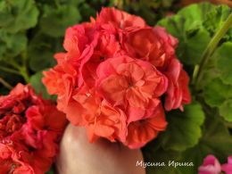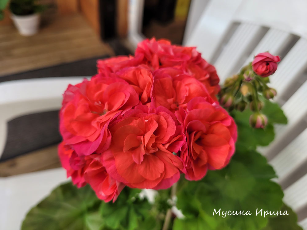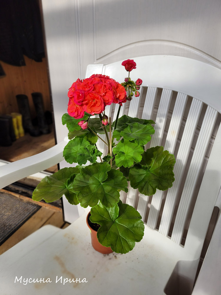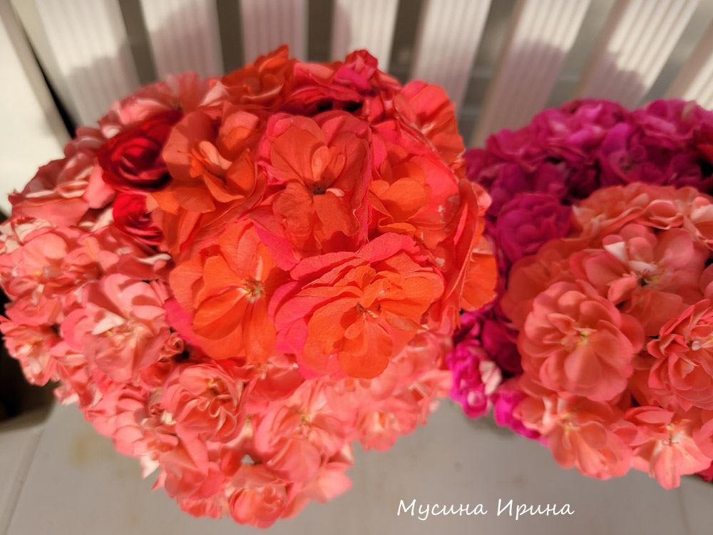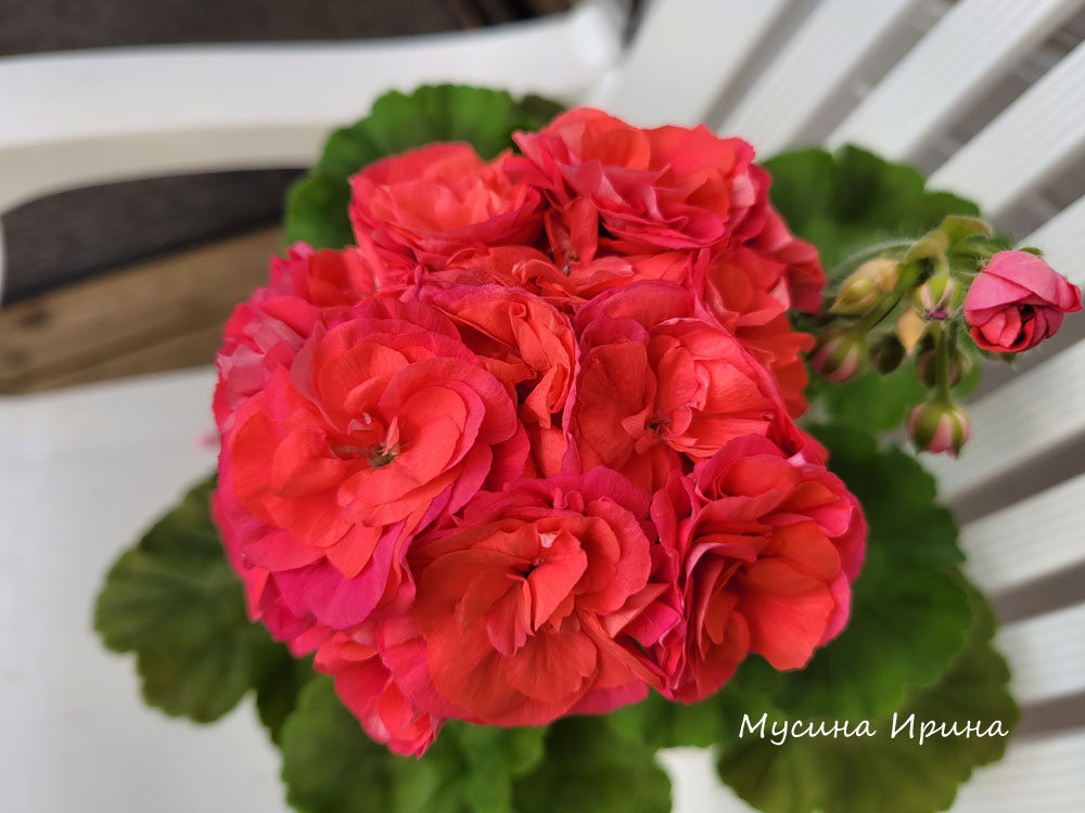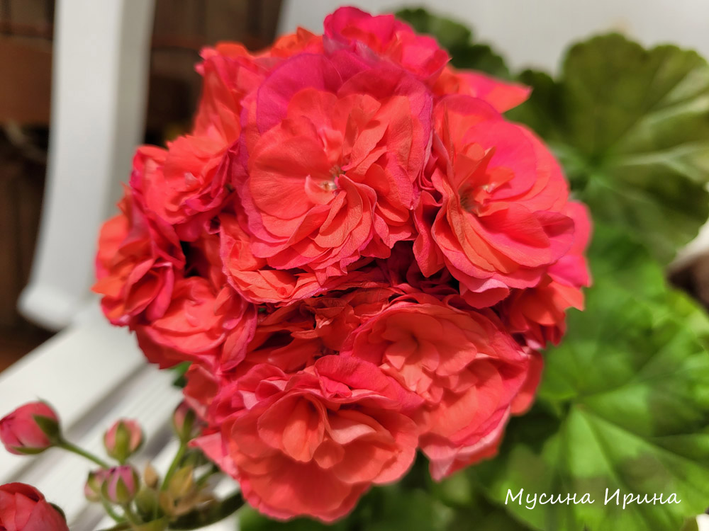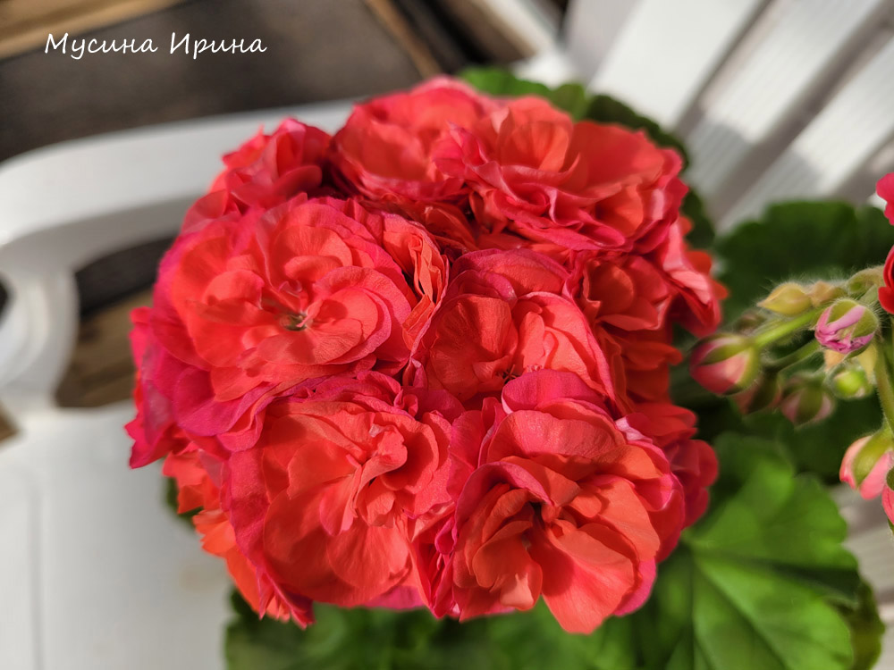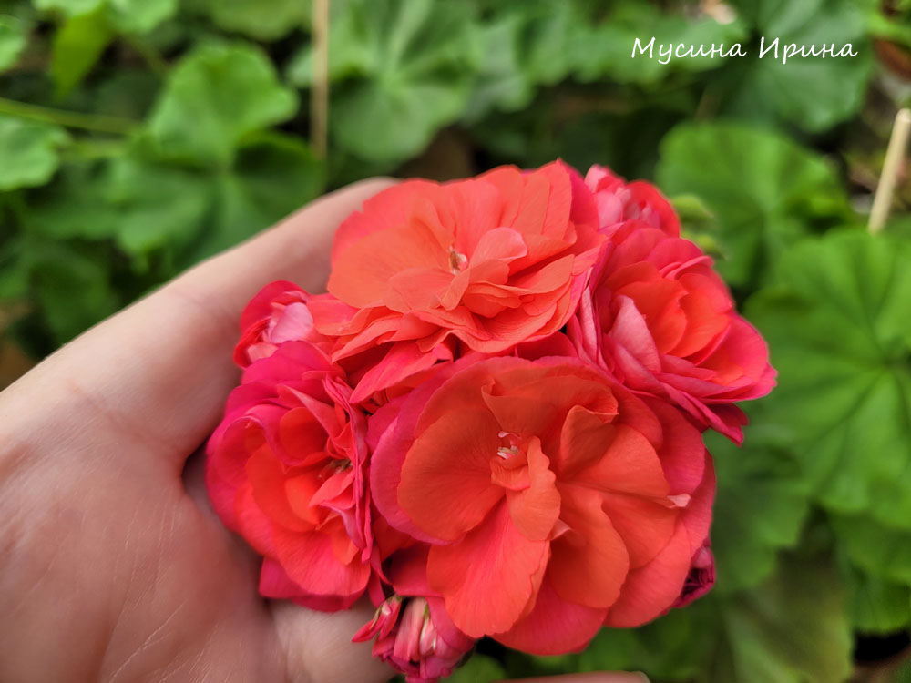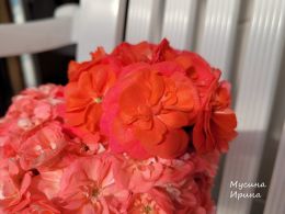 Этот сорт отличается от остальных уникальной расцветкой - цветы ярко-оранжевые в центре и плавно переходящие в малиновый оттенок по краям, махровые, крупные, соцветия тоже большие, на прочных цветоносах, которые легко держат их вертикально без опоры. У сорта очень мощный и крупный куст, поэтому изначально я сомневалась, ставить ли его сортом, но по отзывам, далеко не всем нужны мини и карлики, поэтому Джеймс будет первым в новой сортосерии крупных сортов. Обязательно учитывайте эту особенность, так как ни маленький объем, ни формировка, не сделает его маленьким пушистиком. Но сорт активно участвует в опылениях, поэтому надеюсь, когда-нибудь удастся получить потомство с карликовым кустиком и подобной расцветкой. Сорт чисто-зональный, получен от Таиры Февронии.