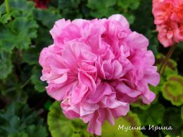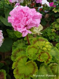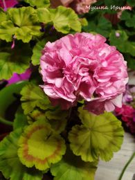 У сорта яркие кружевные салатовые листья, контрастная зональность, цветы розовые, холодного оттенка, махровые, среднего размера. Куст карликовый, ветвистый, зональный, по степени прихотливости средний. Интересно, что в межсезонье, цветы светлеют до почти белого :) Конечно, у золотолистных сортов не такие шикарные и крупные шапки, но они нарядны в комплексе, яркая листва и компактный кустик хорошо смотрятся даже с небольшими шапочками :)