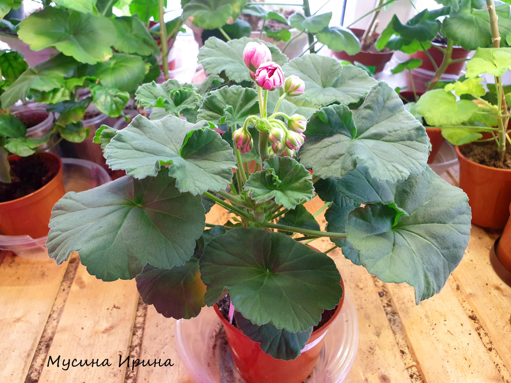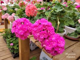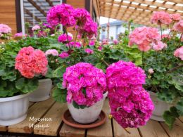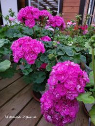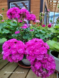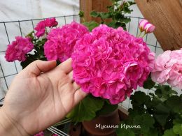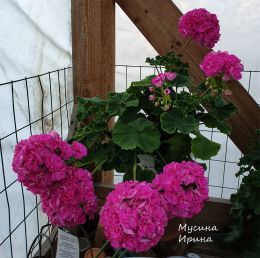 Зональная пеларгония. Роскошнейший и один из лучших сортов Юлии Озёрской. Крупные махровые цветы красивой формы, в виде многослойных блюдечек, цвет густой, цикламеновый. Куст очень компактный, коренастый, листья небольшие, плотные, бархатные. Сорт неприхотливый.
