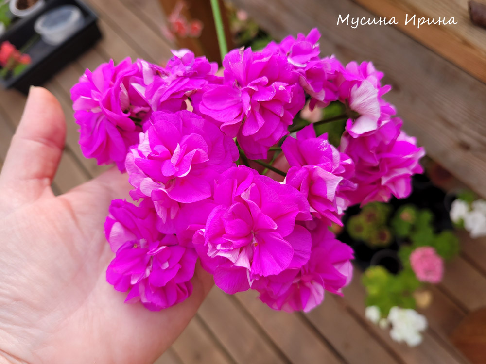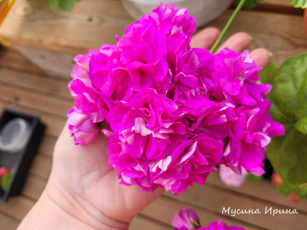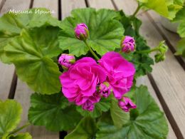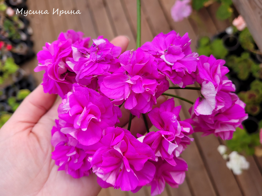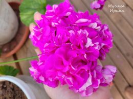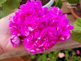Сорт выдающегося цвета, цветы махровые, красивой формы, крупные, густо-лилового цвета с белой изнанкой, в зональных пеларгониях такой цвет не встречается. Сорт сложного гибридного происхождения. Куст проблемный (у меня), не получилось вырастить "пушистый" кустик, цветоносы длинные, соцветия рыхлые. Листья полуглянцевые, без зоны. На мой взгляд сорт тоже коллекционный, не коммерческий. Собственно держу такие сорта для получения этого цвета на крепком зональном кусте.